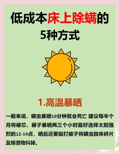 〖Five〗、正确除螨 不止低成本 而且简单方便 一;高温暴晒 适用范围 枕头、棉被、毛毯、毛绒玩具、凉席等不宜水洗的物品, 大操作方法 长时间暴晒法:8个小时以上的紫外线照射,会将尘螨杀死,另一方面,日晒也可以使被褥保持干燥,创造尘瞒不适宜的生存环境。