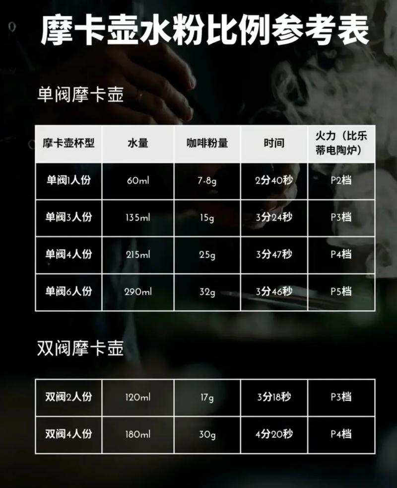 日常家用一般建议分2份,适合单人分次饮用或两人分享。比如1份加奶做拿铁,另1份直接饮用。 浓度受摩卡壶操作影响明显 双阀摩卡壶压力更强,若想减少苦味,可尝试控制萃取时间:火焰调至中小火,听到“呲呲”声后立即离火,用湿毛巾降温壶底中断萃取,避免过度出液。
