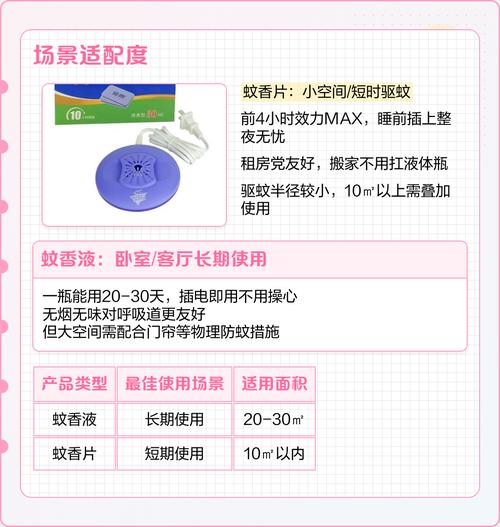 蚊香液比较合适,能持续稳定驱蚊。而在小空间如卫生间、车内等短时间使用,蚊香片快速散发的气味也能起到很好驱蚊作用。 安全性:蚊香液相对更安全,没有明火风险。蚊香片使用明火,如果不小心就可能引发危险,比如孩子玩耍碰到等。所以家里有小孩等需要特别注意安全的人群,使用蚊香液更放心。