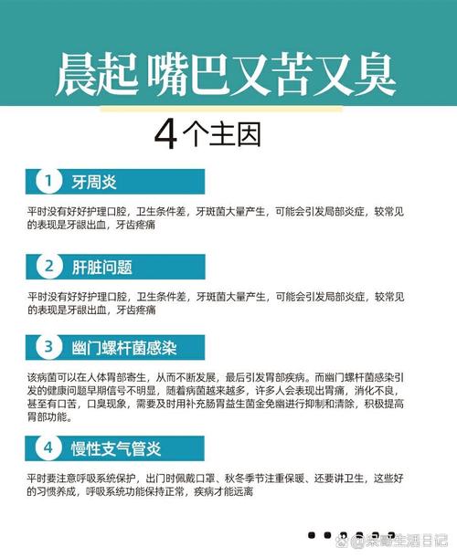 〖Five〗、早上醒来嘴巴苦和臭可能由多种因素导致,需针对性改善:饮食因素辛辣、油腻、刺激性食物(如大蒜、洋葱)及含香料食物易引发口气异味;饮酒、咖啡、吸烟会加重口苦。饮食不规律、暴饮暴食或过度节食可能扰乱胃肠道功能,导致胆汁反流或消化不良,进而引发口苦。