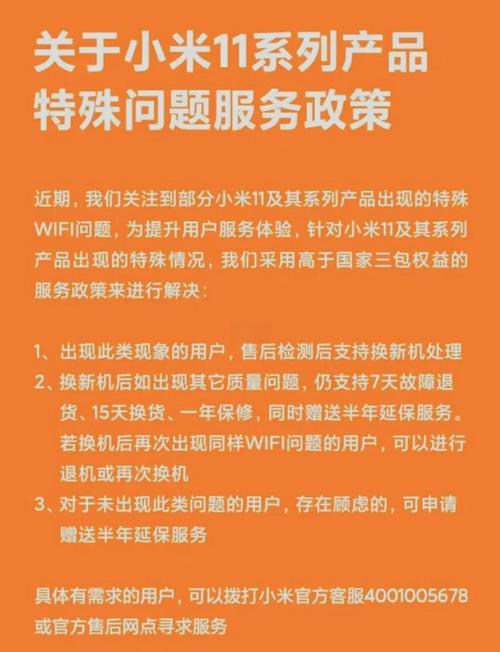 初期售后方案:免费换新+延保半年为平息争议,小米推出以下措施:免费换新机:确认出现WiFi故障的用户可免费更换新机。二次故障处理:若换新后再次出现同类问题,用户可选取退货或再次换机。延保服务:向所有小米11用户赠送半年延保(总保修期延长至5年)。