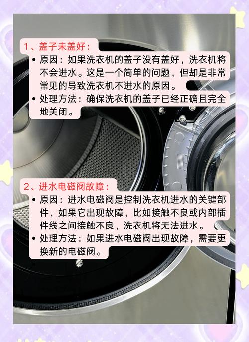 〖Two〗、全自动洗衣机不上水的具体原因和解决方法如下:水源问题 水龙头未打开:确保水龙头完全打开,并且水流畅通。水源异常:检查是否停水、管道是否堵塞或水压是否过低。可以通过其他水龙头或淋浴检查水源是否正常。进水管故障 进水管弯折或扭曲:检查进水管是否有扭曲现象,必要时进行调整,确保水流顺畅。