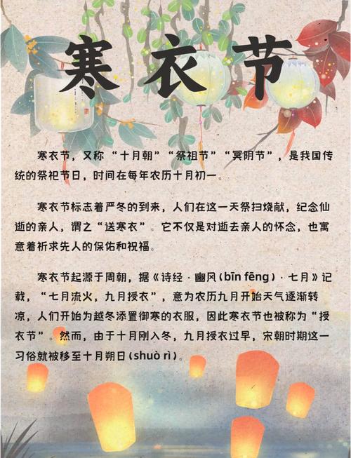 〖One〗、农历十月初一被称为寒衣节,此时进入立冬,天气转冷,人们会给去世的祖先送衣服,以此表达感恩之情并传承孝道文化。纸衣准备:自制纸衣:可以用纸糊制衣服,这种方式虽然需要花费一些时间和精力,但更能体现对祖先的诚意和用心。