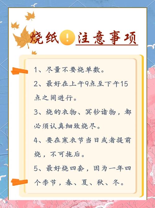 〖Two〗、寒衣节烧纸时间因地域和习俗不同有所差异,综合传统观念和多数地区习惯,建议优先选取上午9点后至下午日落前的时段,具体可根据以下情况调整: 多数地区推荐时段:上午9点后至日落前该时段阳气渐盛且未完全消散,符合“阴阳调和”的传统观念,同时光线充足便于观察焚烧情况,降低火灾风险。