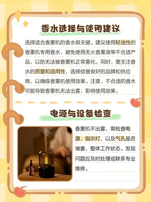 清理堵塞 水垢清理:香薰机可能因为水垢堵塞而不冒烟。此时,可以用小刷子蘸60度的温水刷洗清理,或者使用家醋加少许盐溶解水垢,雾气便会慢慢喷出。注意避免使用强酸,以免损坏机器。 喷嘴清洁:喷嘴脏了或堵塞也会导致香薰机不冒烟。