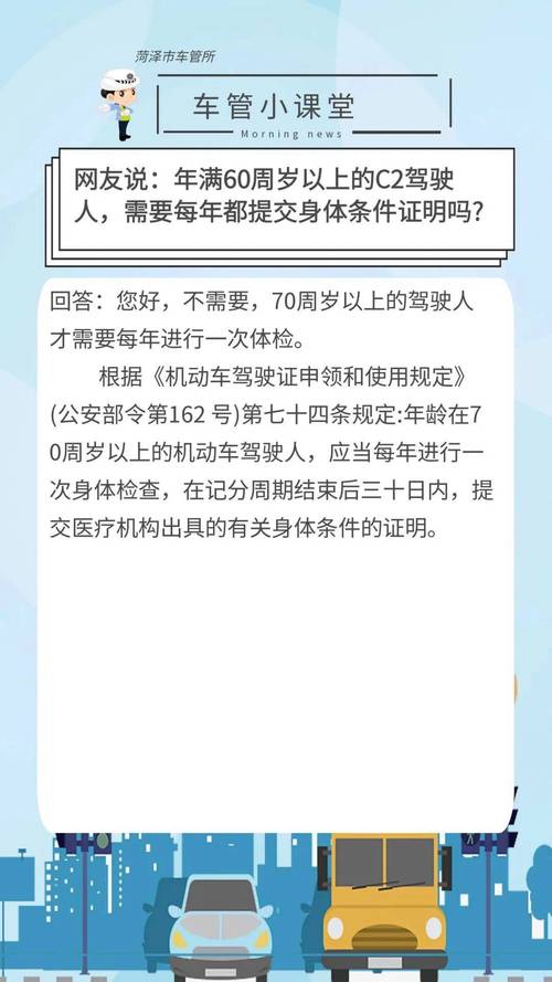 提交身体条件证明: 对象:已取得驾照的驾驶员。 目的:确保驾驶员在行车过程中身体状况良好,不会影响道路交通安全。 检查项目:通常包括视力、听力、血压、心电图等常规检查,以及针对驾驶员特定部位的检查,如颈部、腰部等。