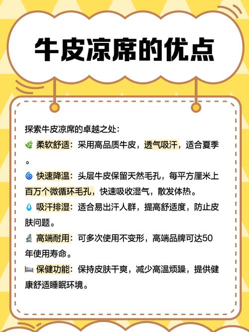 〖Three〗、都不错。牦牛皮席:牦牛皮席具有透气、防潮、防虫蛀、耐磨耐折等优点,凉爽性极佳,适合各年龄段人群使用。水牛皮席:水牛皮席具有透气性好、吸水性强、质地柔软、冬暖夏凉、环保等优点,凉爽性极佳,适合各年龄段人群使用。