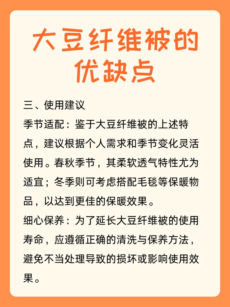 〖Six〗、可能会让敏感人群感到不适。大豆纤维被子适合注重环保、追求舒适透气睡眠的人群,尤其是春秋季使用,或者适合对重量敏感的人。但如果处于潮湿地区或者预算有限,传统棉被或化纤被可能是更好的选取。选购时建议选取正规品牌,关注纤维含量,推荐20%『3』0%的配比,这样能兼顾舒适度与耐用性。
