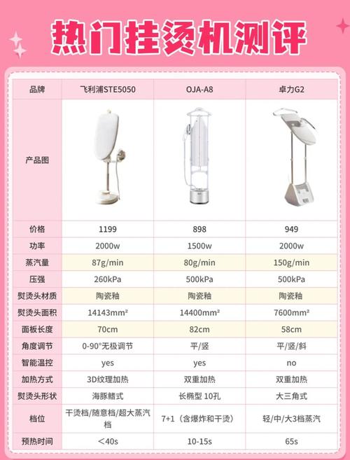 〖Two〗、选购家用挂烫机可从以下方面考虑:核心性能参数蒸汽量与蒸汽速度:蒸汽量建议选75g/min以上,这样穿透力强、熨烫效率高;蒸汽产生速度(预热时间)优先60秒内,能满足快速使用需求。功率:功率在1000 - 2200W为宜,功率越高蒸汽量越大,熨烫速度越快,对于厚重衣物熨烫效果更好。