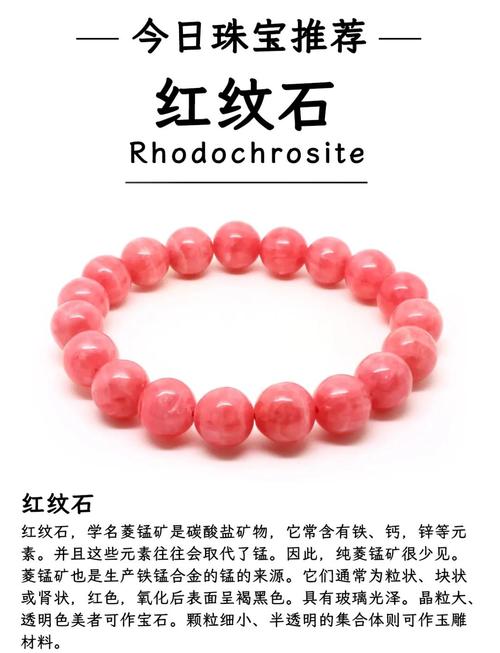 衣物摩擦的抛光效果:在佩戴过程中,红纹石与衣物的摩擦产生类似抛光的效果,使其表面更加光滑和有光泽。这种光泽增强了红纹石的红润感。 红纹石简介:菱锰矿是一种碳酸盐矿物,通常含有铁、钙、锌等元素,这些元素有时会替代锰的位置。纯净的菱锰矿较为罕见。