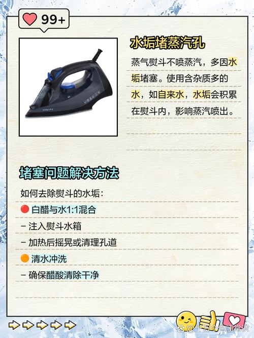 〖One〗、电熨斗不出热气可能有以下几种原因及解决办法:水箱或通风孔堵塞 电熨斗的水箱或通风孔中如果积累了杂质,如浑浊的水或白色粉末,可能会导致蒸汽无法顺畅排出。此时,可以尝试将白醋和水混合后倒入水箱中,加热几分钟进行清洗,然后倒出溶液并再次冲洗水箱,以清除堵塞物。