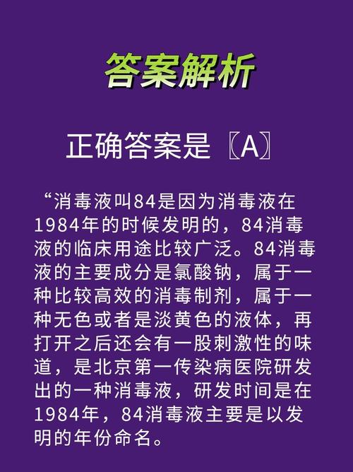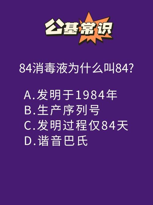 〖One〗、消毒液之所以叫做“84”,是因为它是在1984年被发明的。具体来说,1984年北京第一传染病医院研究出了这种能够快速杀灭各类肝炎病毒的消毒液,最初命名为“84肝炎洗消毒液”,后来才更名为“84消毒液”。