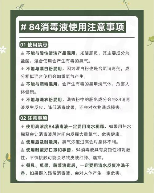 “84”这一名称直接来源于消毒液的研制年份——1984年。后来,为了更广泛地推广和应用,这种消毒液被更名为“84消毒液”,并逐渐成为家喻户晓的消毒产品。消毒原理及用途 84消毒液是一种以次氯酸钠为主要成分的含氯消毒剂。次氯酸钠具有强氧化性,可水解生成具有更强氧化性的次氯酸。
