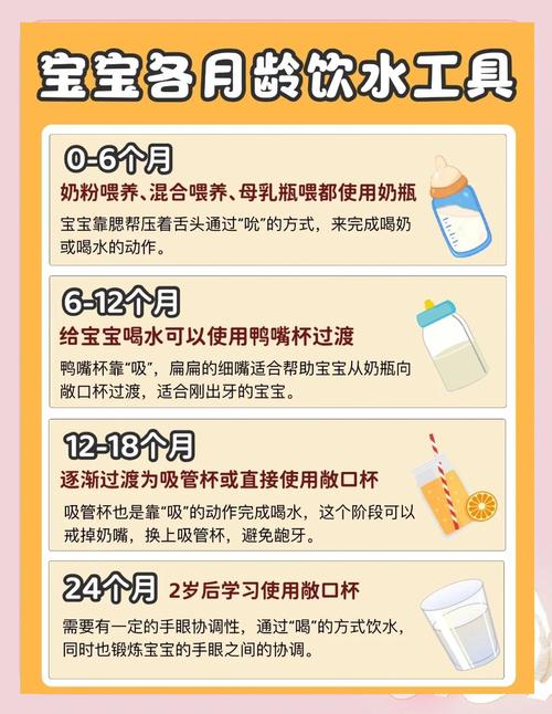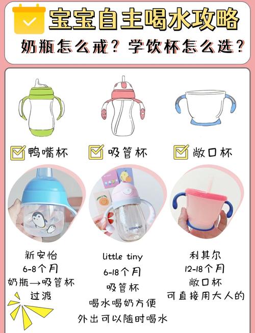 〖One〗、个月开始训练:儿科医生建议,比较好能在婴儿6个月大时就开始尝试让他用水杯饮水,为宝宝提供充足的时间以适应没有奶瓶的日子。1周岁开始减少奶瓶使用:美国儿科研究院建议从婴儿1周岁开始,逐渐减少他使用奶瓶的次数,最晚不要超过1岁半。