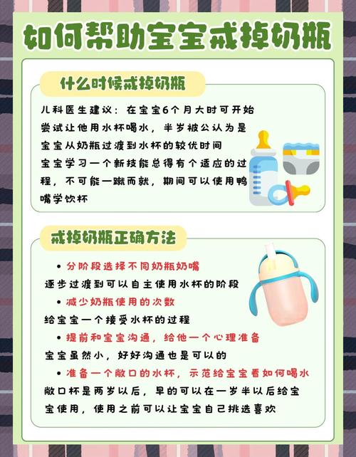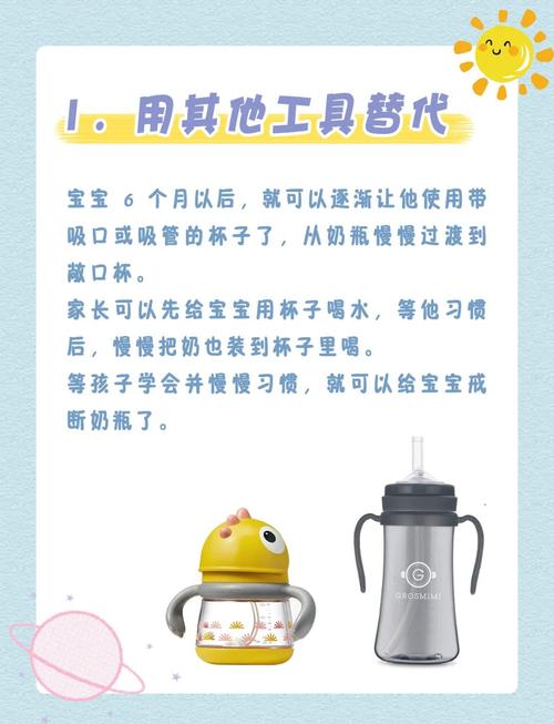 〖Three〗、要给孩子戒掉奶瓶,可以遵循以下步骤:引入水杯:在宝宝半岁左右开始添加辅食时,就可以引入水杯作为奶瓶的替代品。可以选取鸭嘴杯、吸管杯或啜饮杯等适合孩子年龄和口腔发育的杯子。