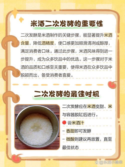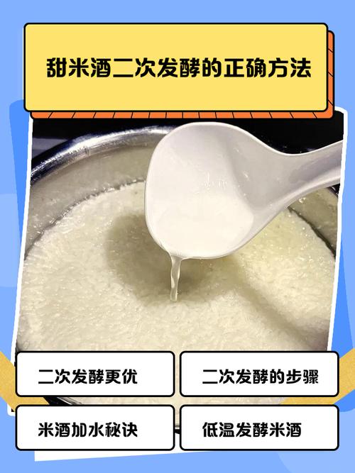 在进行二次发酵时,将原发酵好的米酒原汁与水、酒曲和白砂糖混合,然后放置24至48小时以促进甜味和酒精的产生。 监控发酵过程中的温度是很重要的。理想温度为30℃至32℃,可以通过放置在暖气附近或使用热水袋等方法来保持温度。 在二次发酵期间,应避免频繁移动容器,以免干扰发酵过程。