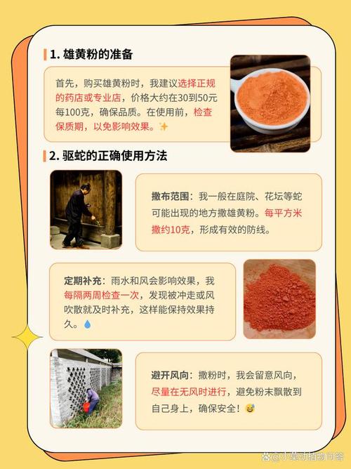 〖One〗、不过,并非所有蛇都对雄黄绝对害怕,不同种类的蛇对雄黄的反应存在差别。硫磺粉:硫磺粉也有较强气味,而且在化学性质上较为特殊。当硫磺粉散发的气味在空气中达到一定浓度时,能对蛇起到驱避效果。硫磺粉在一些情况下会被用于防止蛇类靠近特定区域。 总体而言,虽然二者都有驱蛇作用,但效果并非绝对,会受到蛇的种类、环境等多种因素影响。