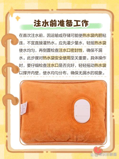 暖水袋使用前不需要灌水,直接装入热水即可使用。新购买的暖水袋可能会有特殊气味,对此,只需清洗外表面并晾干。如果条件允许,可以拆开布袋,将其在通风环境中放置一段时间,以便挥发表面的气味。在填充热水时,应避免使用刚煮沸的沸水,而应使用80至90摄氏度的热水。
