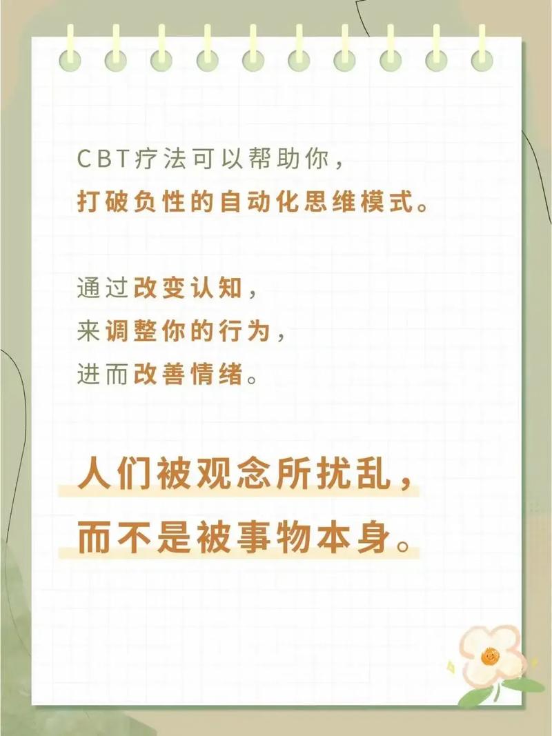 〖Six〗、认知行为疗法(CBT)是一种结合认知疗法与行为疗法的心理治疗方法,其核心目标是通过调整个体对现实世界的认知、态度和看法,纠正不良情绪和行为反应。以下是其核心要点: 理论基础与核心机制CBT基于“认知-情绪-行为”的交互作用模型,认为个体的情绪和行为反应主要由其对事件的认知(而非事件本身)决定。