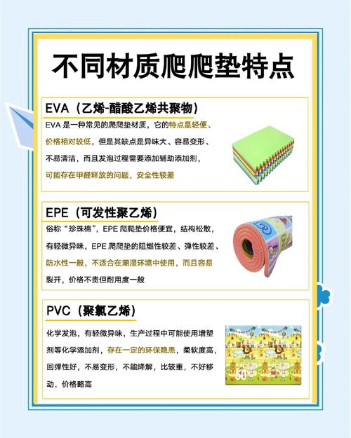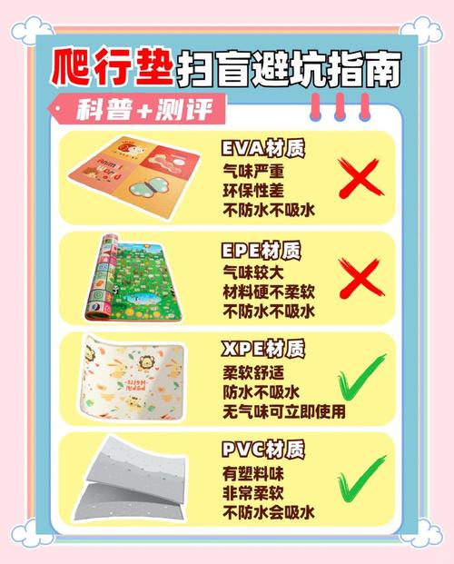 选购爬行垫时,建议选取XPE、EPE或PVC等不含甲酰胺的材质。 避免选取EVA材质:EVA材质的爬行垫中常含有超标的甲酰胺,这是一种具有生殖毒性的化学物质,对儿童的伤害是不可逆的。因此,家长在选购时应尽量避免选取EVA材质的爬行垫。