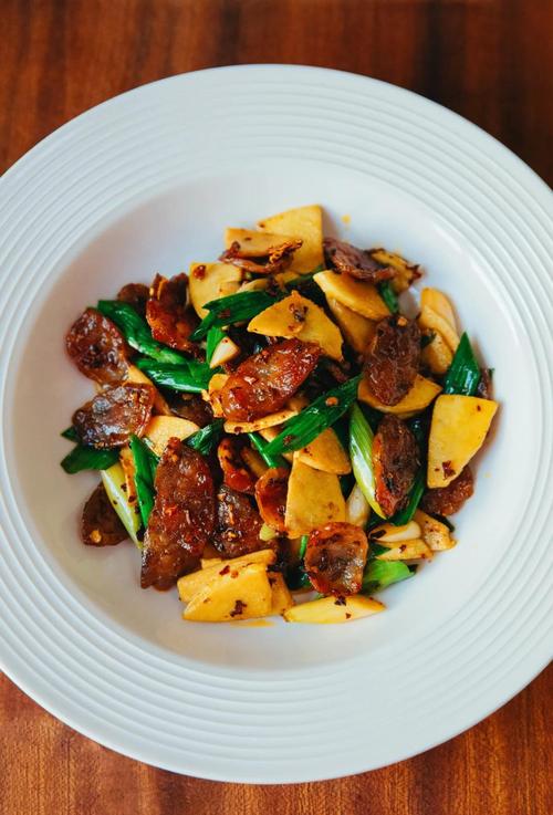 如果是刚干,不需要蒸,直接炒。油五成热时,放入香肠中,中火翻炒一分钟,然后出锅。炒的时候加点蒜,不油腻。我们在锅里放适量的油,等油热了,把大葱和蒜末一起炒。香味出来后,我们把切好的香肠放在锅里翻炒。这时候一定要用中低火慢慢翻炒,让速滴罐里的油流出来。当香肠煎到表面呈棕色时,我们可以用大火翻炒。