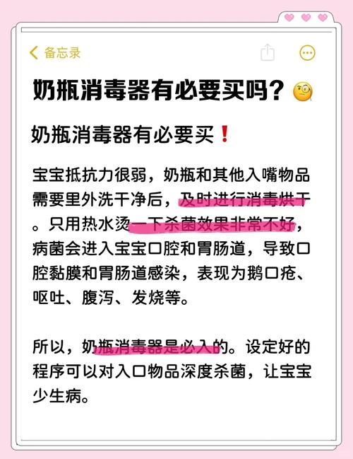 出生后前几个月:每天至少消毒1次新生儿肠胃功能尚未发育完善,奶瓶残留的细菌、病毒易引发腹泻、呕吐等健康问题。因此,在出生后的前几个月,建议每天至少对奶瓶消毒1次。每次使用后,需先用流动水冲洗奶渍,再放入专用消毒容器(如蒸汽消毒锅、沸水煮沸等)进行彻底消毒。