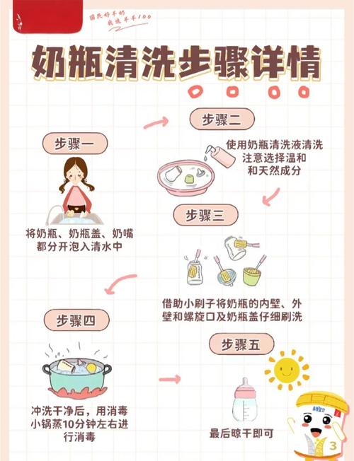 〖One〗、给奶瓶消毒可采用水煮、蒸汽、蒸汽+烘干、紫外线、微波及淘米水冲洗等方法,需根据奶瓶材质选取合适方式并注意操作细节。水煮消毒法使用不锈钢锅,倒入足量冷水,将洗净的奶瓶完全浸没于水中,盖上锅盖后加热至水沸腾,持续煮沸15~30分钟。