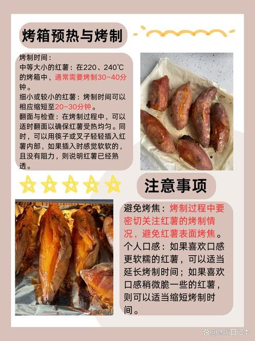 选取新鲜的红薯,比较好选取大小适中、无破损的红薯。将红薯洗净,用厨房纸擦干表面水分。将烤箱预热至200℃。将红薯放在烤盘上,放入烤箱中层,烤约30『4』0分钟,期间要翻动几次,确保红薯均匀受热。烤好的红薯取出,稍微凉一下就可以享用。