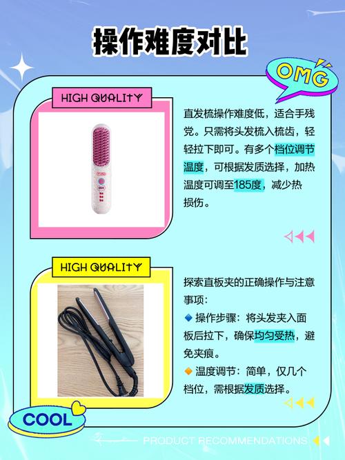 直发梳和直板夹各有利弊。直发梳使用起来更便捷,但直板夹的拉直效果更显著。直发梳直接梳理头发即可,而直板夹需要将头发夹在直板夹中并拉扯。选取哪种工具取决于对直发效果的需求。直发梳的升温速度较慢,且温度不易保持,因此拉直效果可能不如直板夹。