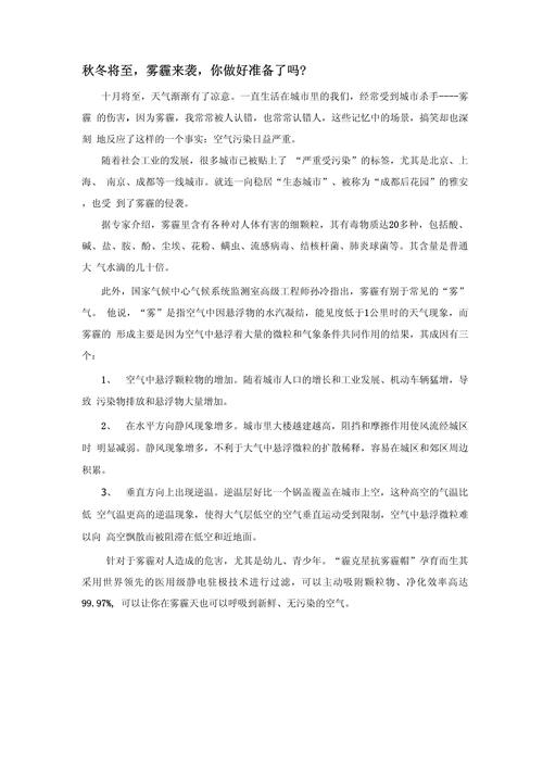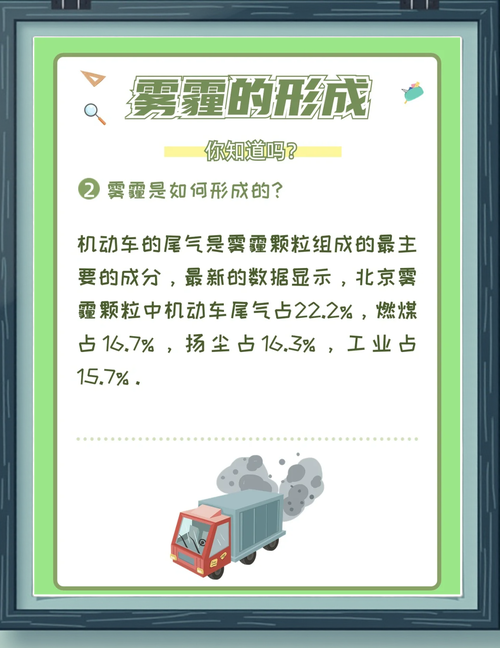 汽车尾气:汽车尾气是形成霾的主要原因之一。随着汽车数量的增加,尾气排放也相应增多,其中的颗粒物和有害气体对空气质量造成严重影响。工业排放:工业生产过程中产生的废气、粉尘等也是重要的污染源。这些污染物在大气中积聚,与空气中的水蒸气结合,形成雾霾。