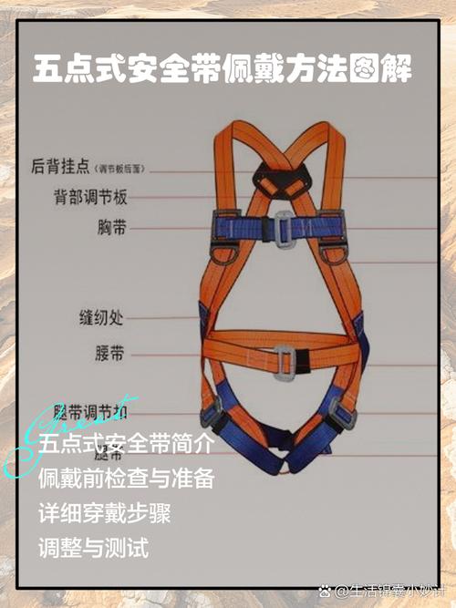 〖Three〗、穿戴安全带:拿起肩带搭到肩上,把胸带放在胸前合适的位置扣好,扎肩带的时候一定要注意背后不要打结。肩带和胸带扎好后,把腰带拿过来穿到肩带的空隙当中。如果是交叉式穿戴,需确保腿带、肩带正确穿过限位扣;五点式安全带应调节各带体与身体保持2『3』指空隙,既保证束缚力又不影响血液循环。