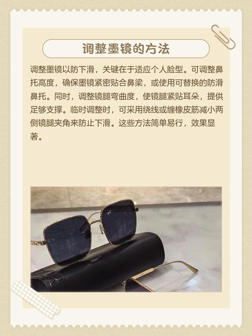 〖Four〗、墨镜老是往下滑的解决方法主要有以下几种:使用防滑工具:防滑套:可以在墨镜的镜腿上安装防滑套。这些防滑套通常由硅胶或其他柔软且富有弹性的材料制成,能够增加镜腿与耳朵之间的摩擦力,从而有效防止墨镜下滑。防滑鼻垫:如果墨镜是因为鼻梁部分支撑力不足而下滑,可以考虑在鼻梁处添加防滑鼻垫。