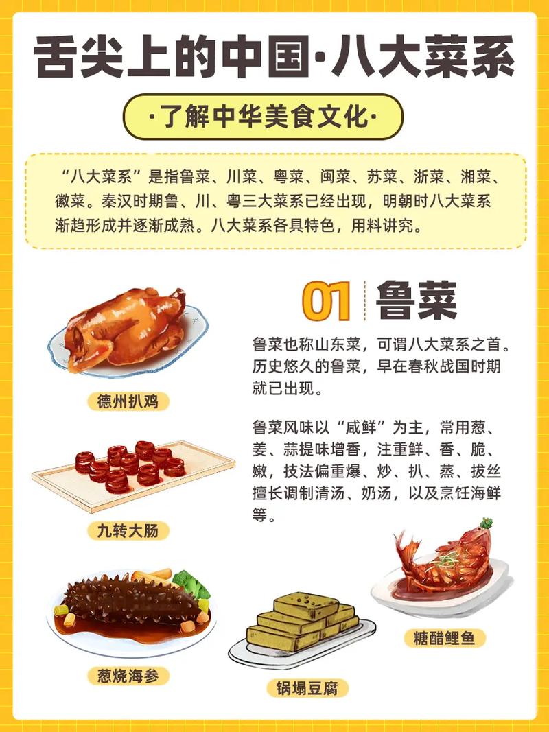 〖Six〗、鲁菜曾在国宴中亮相,但相比其他菜系,其出现的频率较低。 鲁菜制作过程繁琐,耗时且需大量精力,对厨师的技艺有极高要求。 鲁菜口味较为浓郁,不太符合外国人的饮食偏好,因此在世界宴会上不太常见。 鲁菜作为中国八大菜系之一,具有悠久的历史和丰富的烹饪技法。