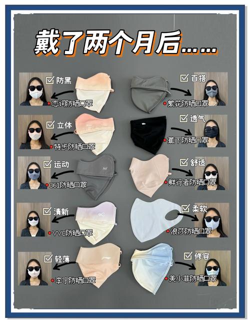 具体颜色推荐:黑色是吸收光线能力很强的颜色,能最大程度吸收紫外线,遮阳效果突出;深蓝色也是不错的选取,其对紫外线的吸收能力也较高,且相对耐脏;深灰色同样具备较好的吸收紫外线能力,同时在视觉上较为柔和,不会过于厚重。所以,从遮阳角度考虑,优先选取这些深色的防晒口罩。