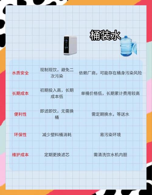 〖Three〗、如果家庭注重饮水的便利性和多样性,且不介意定期更换水桶的成本,那么饮水机可能是一个不错的选取。如果家庭更看重饮水的健康性和经济性,并愿意投入一定的时间和精力进行安装和维护,那么净水器可能更适合。最终选取应根据个人需求和家庭实际情况来决定。