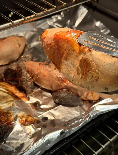 将电烤箱预热至200度左右。烤红薯的时间取决于红薯的大小,通常2『3』磅重的红薯需要烤45分钟至1小时。烤制过程:将红薯放在烤盘上,放入预热的烤箱中。每隔15分钟翻动一次红薯,使其均匀受热。如果红薯表面开始出现焦痕,可以降低温度至180度左右继续烤制。测试熟度:用叉子或牙签轻轻扎入红薯中心。如果可以轻松穿透,说明红薯已烤熟。