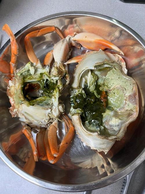 〖Two〗、螃蟹蒸完有绿色的膏是因为螃蟹太小,蟹膏部位没有发育完全。以下是详细解释:蟹膏的正常颜色:蟹膏是雄蟹精囊的精液与器官的集合,正常的蟹膏颜色为白色。绿色蟹膏的原因:当螃蟹太小,其蟹膏部位还没有完全发育时,蒸熟的蟹膏可能会呈现绿色。