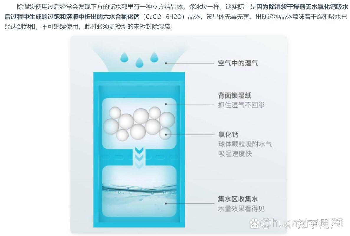 除湿袋结晶的原理是在反应过程中产生二氯化钙晶体。除湿袋内的颗粒为无水氯化钙,易脱盐。水与氯化钙发生反应,释放出大量热量,属于物理反应。无水氯化钙从空气中吸收水分并溶解在其中形成饱和溶液。