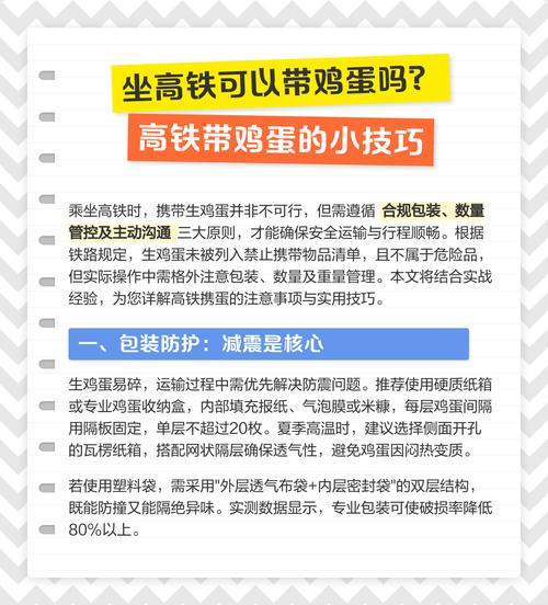 尽量不要托运:虽然生鸡蛋可以携带,但建议不要办理托运。因为托运过程中,行李可能会受到较大的冲击和挤压,增加鸡蛋破碎的风险。此外,托运工作人员可能不清楚包裹内是生鸡蛋,从而未能给予特殊的轻拿轻放处理。考虑煮熟携带:为了减少破碎的风险和满足安检要求,可以将鸡蛋煮熟后携带。