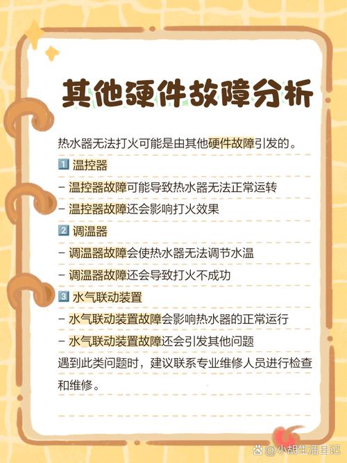 〖Four〗、其次,点火系统的问题也可能导致热水器无法打火。例如,脉冲点火器和控制器故障、点火针偏位或老化、电磁阀故障或损坏等。这些问题都会影响点火系统的正常工作,从而导致热水器无法启动。另外,还有一些其他因素可能导致热水器在天冷时打不着火。例如,电源线路故障、水压过低、水管冻结或喷头堵塞等。