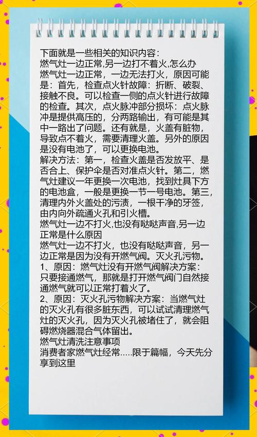 〖Four〗、天然气灶打不着火,最常见的原因是电池电量不足、火孔堵塞或点火针异常,可以通过逐步排查解决。 基础排查 先检查燃气表是否正常供气(余额不足或阀门未开会导致断气),确认后按下灶具旋钮观察是否有“嗒嗒”点火声。若无声,优先考虑电池问题(多数灶具使用1号电池,建议每半年更换一次)。