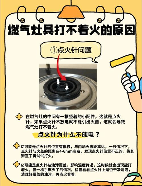 〖One〗、天然气灶有电却打不着火,常见原因有五种:点火针受污、火盖堵塞、微动开关失灵、高压线脱落或电池接触不良。 点火针问题 厨房油污和汤汁容易包裹点火针金属头,导致无法产生电火花。用砂纸轻擦金属部分,同时确认点火针与火盖距离在4『6』毫米之间(约一根牙签的长度),距离过远会影响放电效果。