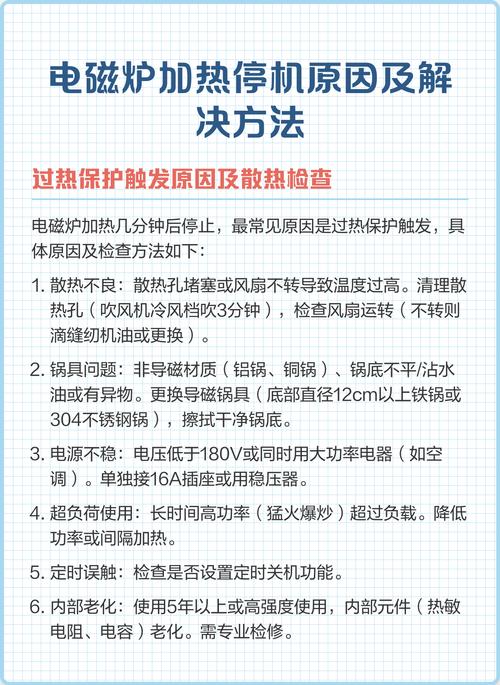 电磁炉加热一会就停通常由过热保护、锅具不匹配或内部故障引起,需要逐一排查解决。 过热保护触发电磁炉长时间工作或散热不良会导致内部温度过高,自动启动保护机制停止加热。先检查进风口和散热风扇是否被油污或杂物堵塞,用软布和棉签清理确保通风顺畅。