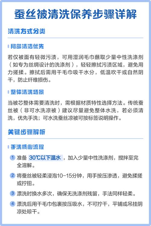 蚕丝被的清洗需根据结构分情况处理,被套可拆洗,被芯以局部清洁为主;保养需注意使用习惯、晾晒方式和存放环境。蚕丝被的清洗方法被套清洗:蚕丝被通常由蚕丝(被芯)、内套和被套三层组成,被套可直接拆下用冷水清洗,材质多为棉质或化纤,按常规衣物洗涤方式处理即可。