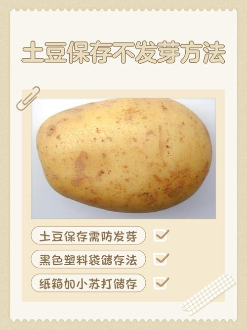 〖Two〗、我知道的土豆保存不发芽的方法:苹果保存法、避光保存法、小苏打保存法,希望能帮到你们。 苹果保存法 我们可以将新鲜的土豆加上一个苹果放进塑料袋子里,把袋子里的空气全部挤压出去,然后扎紧袋口就可以了。