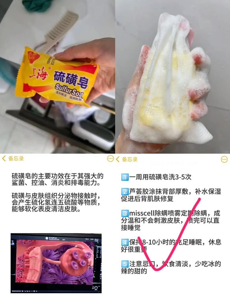 〖Five〗、使用硫磺皂沐浴可以深度清洁背部皮肤,去除多余的油脂、污垢和死皮细胞,有助于疏通毛孔,减少痘痘的形成。改善肌肤健康:经过一星期的连续使用,硫磺皂可以彻底清除背部的螨虫,使肌肤变得更加健康、清爽。这对于预防痘痘的复发以及改善整体肌肤状态都是非常有益的。