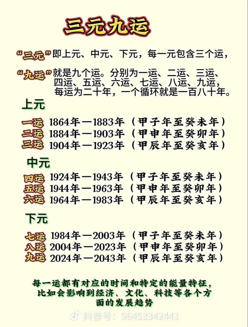 三元九运是中国古老黄历的一种,主要用于风水学中的运势预测,其推算方法基于洛书九宫之数。三元九运的定义: “三元”指上元、中元、下元,每元60年,共180年。 “九运”则是将每个“元”再细分为三个小运,每个小运20年,共九个小运。