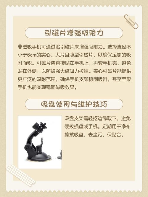 〖Three〗、若吸盘老化、变形或有破损,也难以吸牢。此时可考虑更换新的吸盘。另外,温度也可能有影响。在寒冷环境中,吸盘的吸附力可能会下降,可以将手机和支架放在温暖的地方一会儿,再进行安装。还可以尝试在吸盘上涂抹少量水,增加密封性,提高吸附力。 清洁吸附表面是关键。