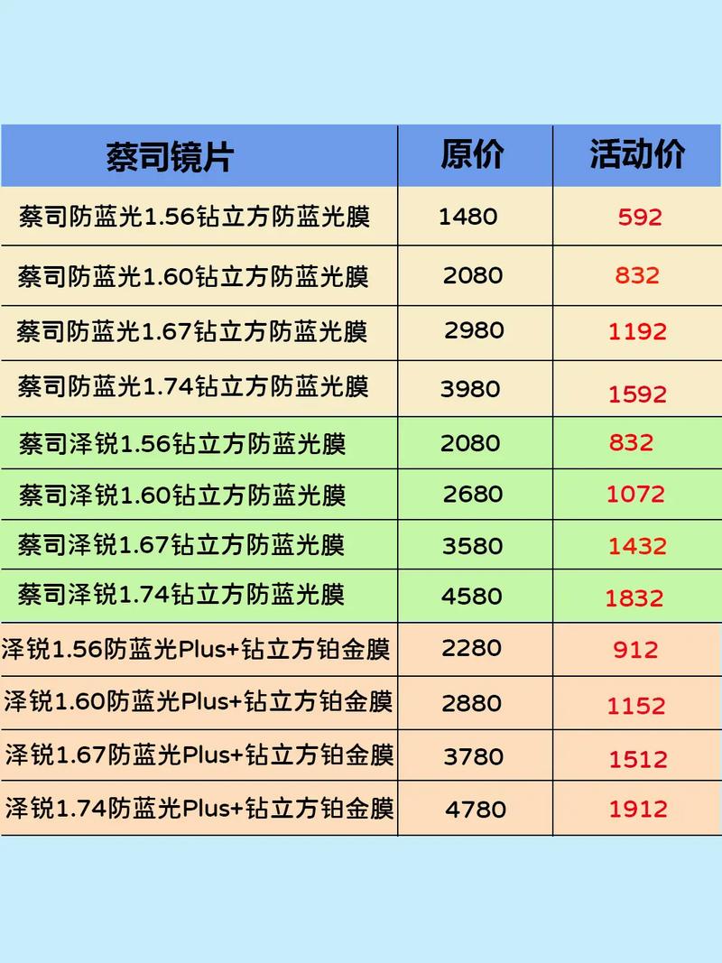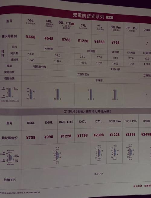 〖Four〗、防蓝光镜片的费用通常在500元左右,但具体费用会根据您的需求而有所不同。首先,您需要考虑镜片的折射率,建议选取60或67的折射率。品牌方面,如果您预算充足,可以选取依视路A4系列或蔡司防蓝光系列,这些品牌的费用通常在一两千以上。如果您更注重性价比,可以选取费用在三四百左右的平价品牌。