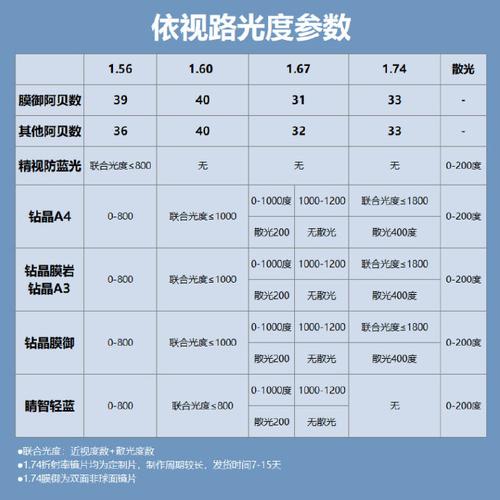 〖Six〗、首先,我们来了解一下镜片的详细信息。依视路钻晶A4系列镜片的折射率为56,采用非球面设计,具备防紫外线和防蓝光功能。材质方面,这款镜片采用了树脂材料,度数为225度,散光为50度,售价为xxx元。除此之外,镜片还具有减少反光、防水、耐污、耐磨损、抗尘等功能。